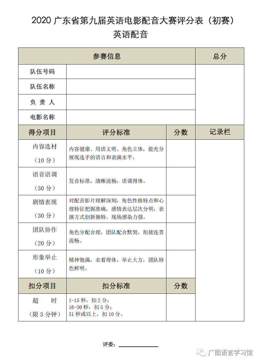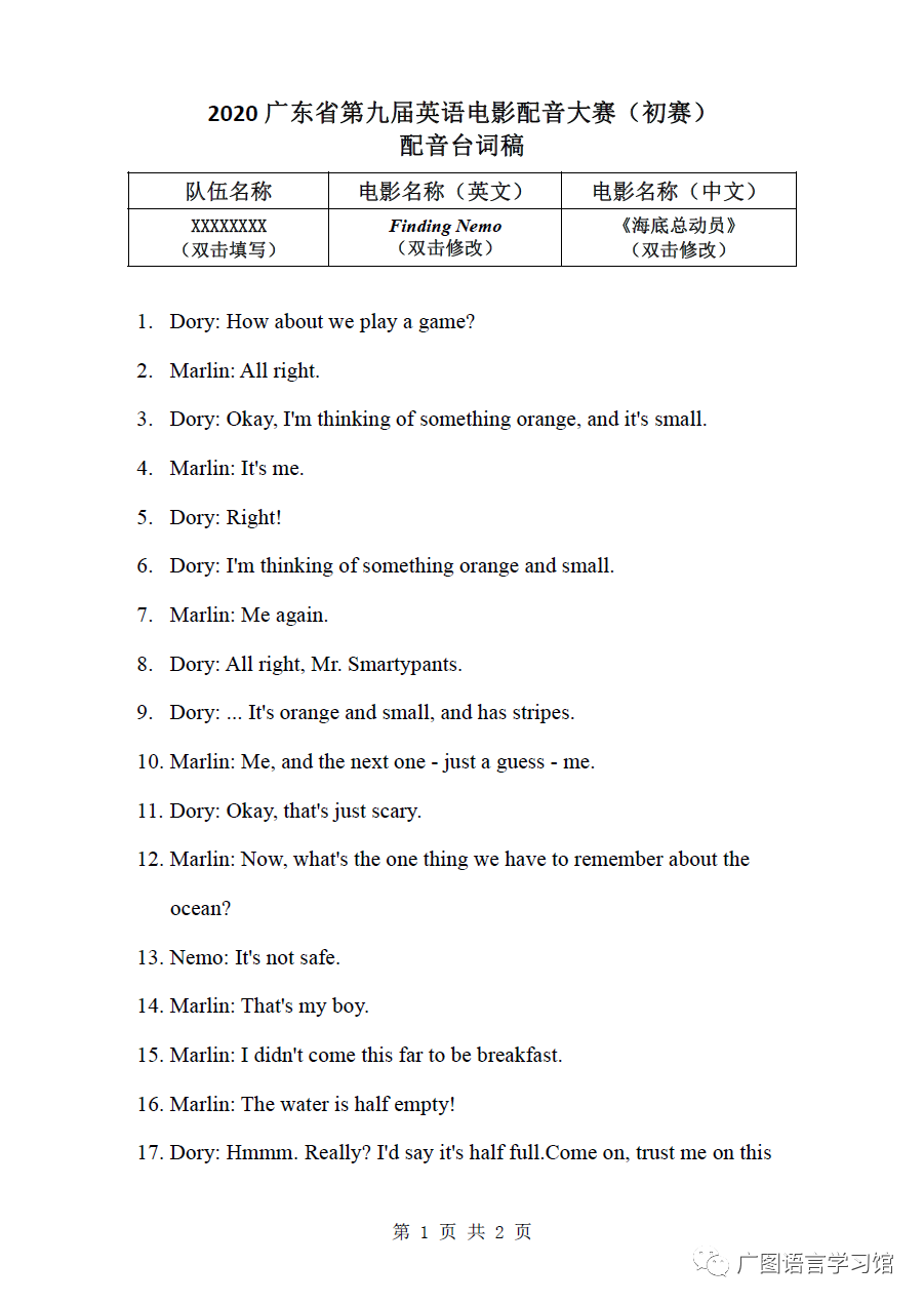 参赛队伍自选一部英语电影,截取部分片段用作英语配音。片段时长不得超过3分钟,以2分30秒至3分钟为宜。