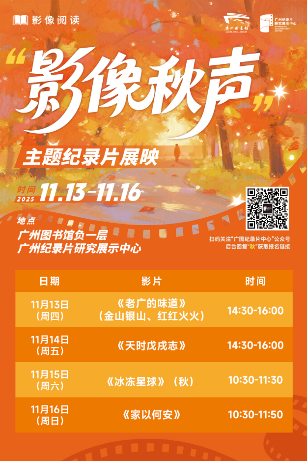 11月13日至11月16日,我们策划了一期影像秋声主题展映,放映纪录片《老广的味道》《天时戊戌志》《冰冻星球》《家以何安》《烽火赤子心》等纪录片,邀请观众一起来纪录片,赴一场秋天的盛宴,在秋色中领悟关于时间、记忆与生命循环的沉思。