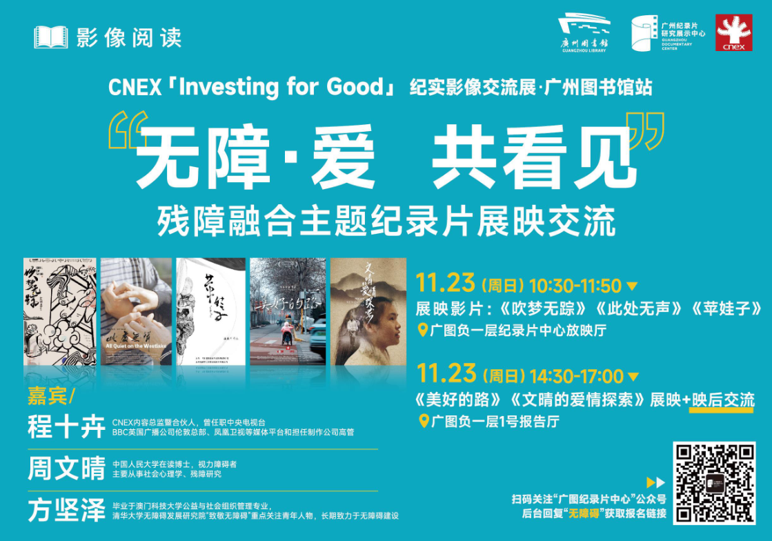 为让“无障碍”跨越设施边界、抵达心灵深处,广州图书馆携手CNEX特别策划本次“无障?爱”主题纪录片展映交流活动,旨在通过纪录片展映呈现残障群体的真实生命力,通过交流对话消融认知隔阂与心灵壁垒,让平等包容的信念在共情中扎根,让共生共融的力量推动社会向暖而行。