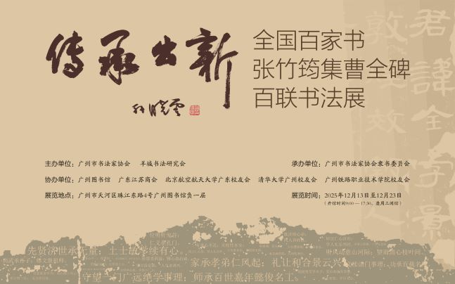 本次展览以“传承出新 ”为核心宗旨,旨在弘扬中华优秀传统文化,推动隶书艺术的繁荣发展。通过集中展示以经典汉隶《曹全碑》为宗,书写张竹筠先生精选创作的百副楹联作品,呈现古老碑帖在当代语境下的活化与创新。展览将汇聚全国百位隶书爱好者的精品力作,展现对传统经典的深入理解与个性化诠释,搭建一个高水平的艺术交流平台,为广州这座历史文化名城注入新的书法艺术活力,满足人民群众日益增长的精神文化需求。