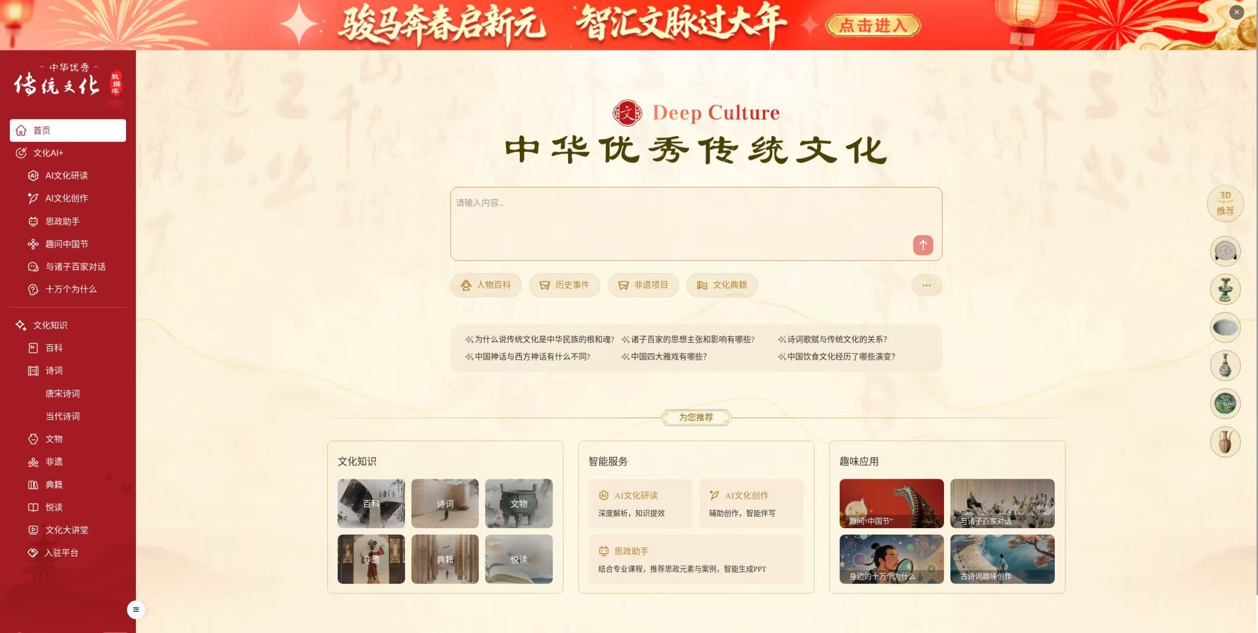 登录《中华传统文化数据库》(网址:https://aiwh.cnki.net/),点击上方banner图“骏马奔春启新元 智慧文脉过大年”即可进入专题阅读活动页面。