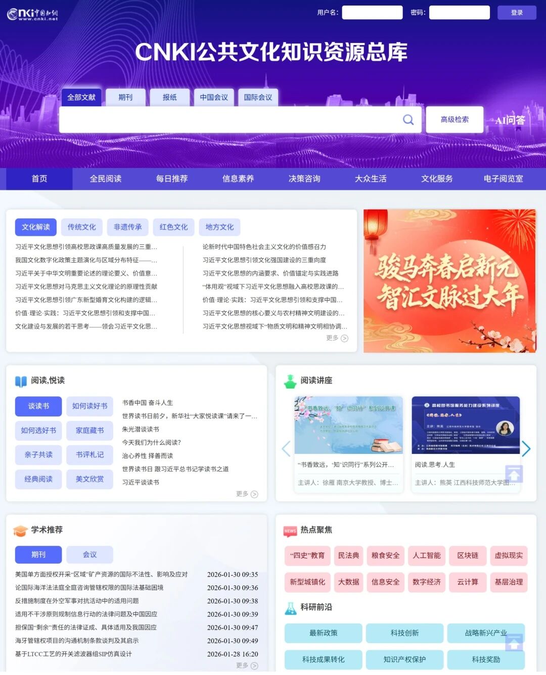 2.登录《CNKI公共文化知识资源总库》(网址:https://cp.cnki.net/),点击右侧红色活动页面入口,即可进入专题阅读活动页面。