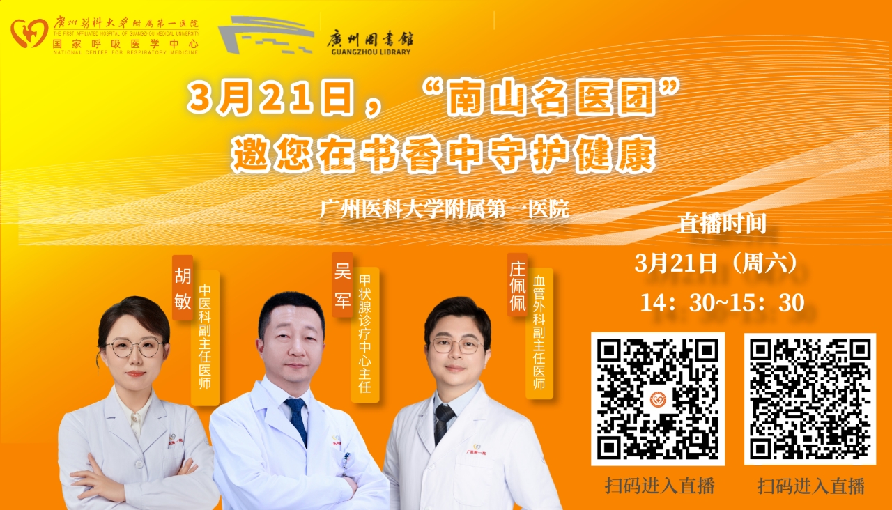 为帮助市民朋友科学应对春季健康挑战,广州图书馆再度携手广州医科大学附属第一医院南山名医团队,推出第二期“南山名医送健康”健康公益专场活动。本期活动聚焦春季常见健康问题与女性专属健康需求,汇聚中医科、血管外科、甲状腺诊疗中心三大专科权威专家,以“专家讲座+专科义诊+公益筛查”三位一体的形式,为广大市民提供一站式、可触及的健康服务,让书香与健康同行,守护您和家人的春日安康。