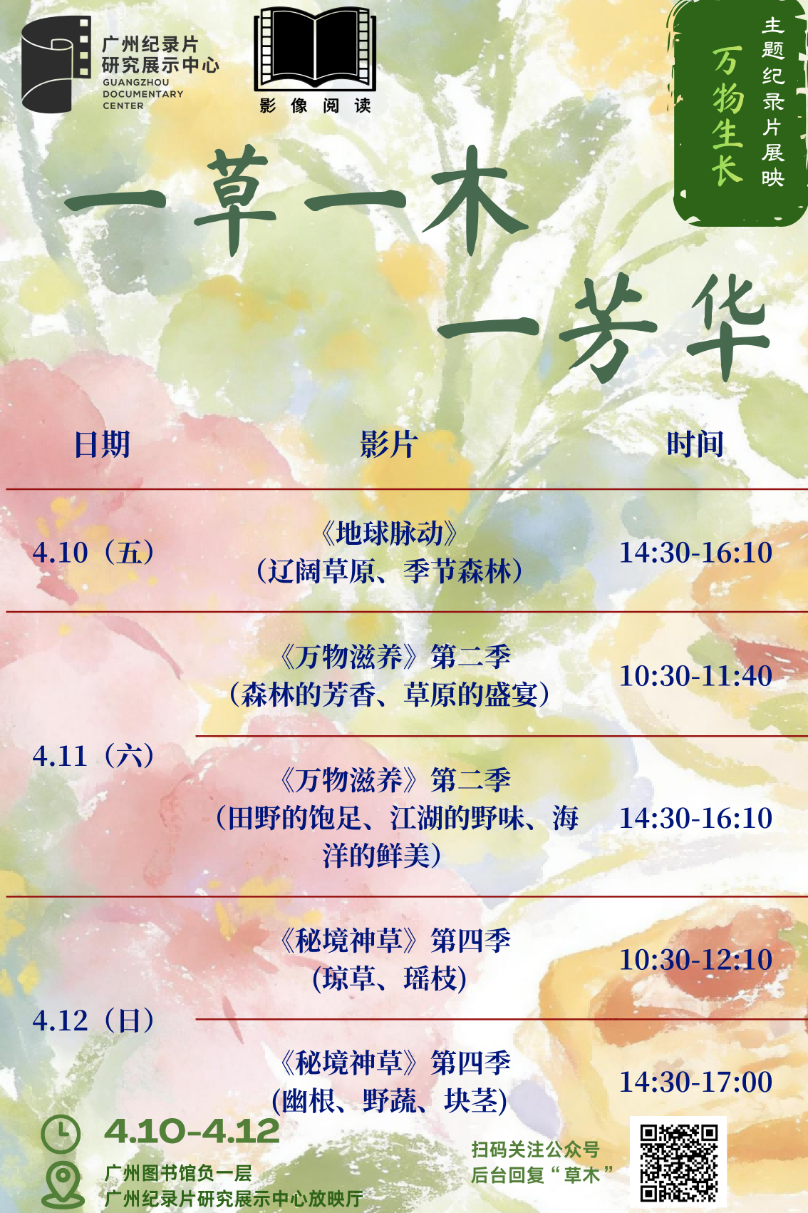 在忙碌的日常里,我们很少有机会静下心,去留意那些悄悄生长的草木,感受自然里最质朴的生机。4月10-12日广图纪录片中心特别推出“一草一木一芳华”万物生长系列纪录片展映,精选《地球脉动》《万物滋养》《秘境神草》三部作品,用最真实的镜头,捕捉山野间、森林里、原野上的自然万象,把藏在天地间的绿意与美好,都呈现在光影里。没有多余的修饰,只是顺着自然的脉络,将草木荣枯、万物生长的模样娓娓道来,带着我们暂时跳出快节奏的日常,沉浸式拥抱一片治愈的绿意。