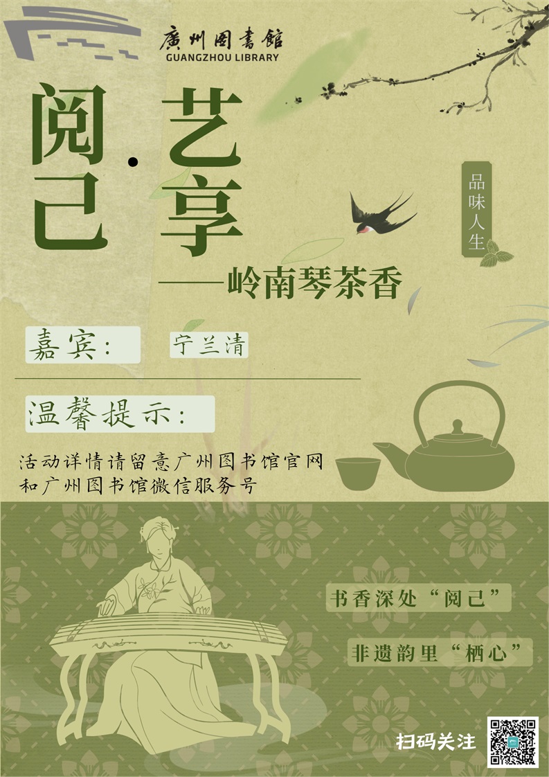请关注“广州图书馆”官方微信公众号,点击菜单栏【互动】-【活动报名】,在活动列表中找到 “岭南琴茶香阅读疗愈” 进行预约。